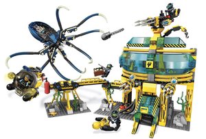 Bouw op de zeebodem onder de golven, deze high tech Aqua Raiders hoofdkwartier. Met een dock, controle centrum en een kraanarm, lanceerplatform voor een minionderzeeër en een duikklok voor verkenning.